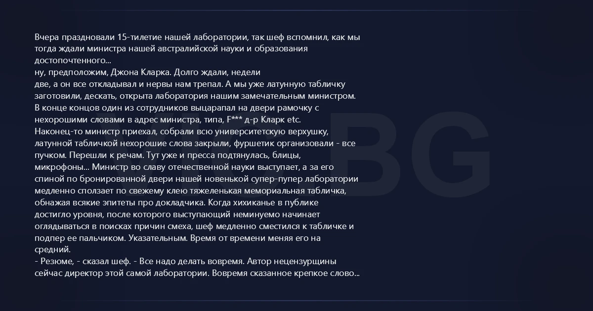 Вчера праздновали 15-тилетие нашей лаборатории, так шеф вспомнил, как мы тогда ждали министра нашей австралийской науки и образования достопочтенного... ну, предположим, Джона Кларка. Долго ждали, недели две, а он все откладывал и нервы нам трепал. А мы уже латунную табличку заготовили, дескать, открыта лаборатория нашим замечательным министром. В конце концов один из сотрудников выцарапал на двери рамочку с нехорошими словами в адрес министра, типа, F*** д-р Кларк etc. Наконец-то министр приехал, собрали всю университетскую верхушку, латунной табличкой нехорошие слова закрыли, фуршетик организовали - все пучком. Перешли к речам. Тут уже и пресса подтянулась, блицы, микрофоны... Министр во славу отечественной науки выступает, а за его спиной по бронированной двери нашей новенькой супер-пупер лаборатории медленно сползает по свежему клею тяжеленькая мемориальная табличка, обнажая всякие эпитеты про докладчика. Когда хихиканье в публике достигло уровня, после которого выступающий неминуемо начинает оглядываться в поисках причин смеха, шеф медленно сместился к табличке и подпер ее пальчиком. Указательным. Время от времени меняя его на средний. - Резюме, - сказал шеф. - Все надо делать вовремя. Автор нецензурщины сейчас директор этой самой лаборатории. Вовремя сказанное крепкое слово никому не мешает. Студенты и аспиранты призадумались. По-моему, они что-то затевают.