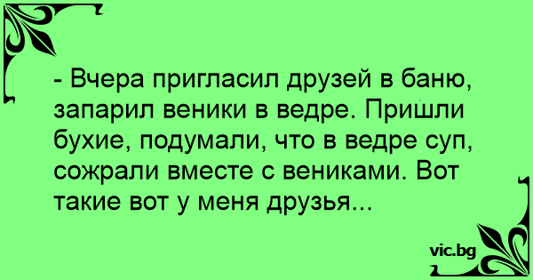 - Вчера пригласил друзей в баню, запарил веники в ведре. Пришли бухие, подумали, что в ведре суп, сожрали вместе с вениками. Вот такие вот у меня друзья...