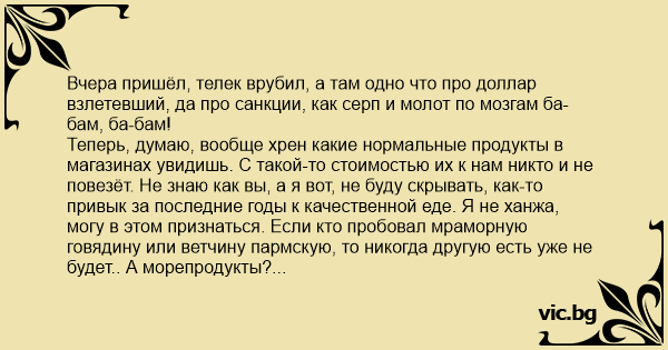 Вчера пришёл, телек врубил, а там одно что про доллар взлетевший, да про санкции, как серп и молот по мозгам ба-бам, ба-бам!