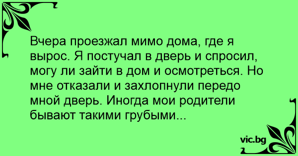 Вчера проезжал мимо дома, где я вырос. Я постучал в дверь и спросил, могу ли зайти в дом и осмотреться. Но мне отказали и захлопнули передо мной дверь. Иногда мои родители бывают такими грубыми...