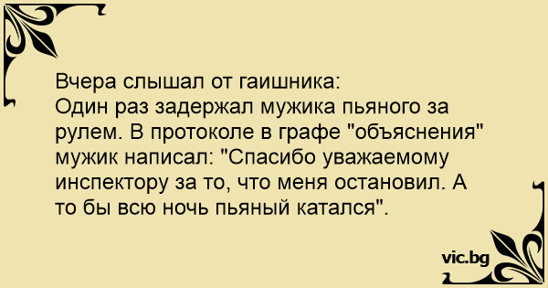 Вчера слышал от гаишника:<br />Один раз задержал мужика пьяного за рулем. В протоколе в графе "объяснения" мужик написал: "Спасибо уважаемому инспектору за то, что меня остановил. А то бы всю ночь пьяный катался".