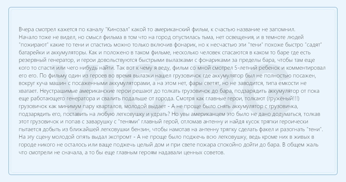 Вчера смотрел кажется по каналу "Кинозал" какой то американский фильм, к счастью название не запомнил. Начало тоже не видел, но смысл фильма в том что на город опустилась тьма, нет освещения, и в темноте людей "пожирают" какие то тени и спастись можно только включив фонарик, но к несчастью эти "тени" похоже быстро "садят" батарейки и аккумуляторы. Как и положено в таком фильме, несколько человек спасаются в каком то баре где есть резервный генератор, и герои довольствуются быстрыми вылазками с фонариками за пределы бара, чтобы там еще кого то спасти или чего нибудь найти. Так вот к чему я веду, фильм со мной смотрел 5-летний ребенок и комментировал его его. По фильму один из героев во время вылазки нашел грузовичок где аккумулятор был не полностью посажен, вокруг куча машин с посаженными аккумуляторами, а на этом нет, фары светят, но не заводится, типа емкости не хватает. Неустрашимые американские герои решают до толкать грузовичок до бара, подзарядить аккумулятор от пока еще работающего генератора и свалить подальше от города. Смотря как главные герои, толкают (гружёный!!!) грузовичок как минимум пару кварталов, молодой выдает - А не проще было снять аккумулятор с грузовичка, подзарядить его, поставить на любую легковушку и удрать? Но увы американцем это было не дано додуматься, толкав этот грузовичок и попав с заварушку с "тенями" главный герой, отломав антенну и найдя кусок тряпки героически пытается добыть из ближайшей легковушки бензин, чтобы намотав на антенну тряпку сделать факел и разогнать "тени". На эту сцену молодой опять выдал экспромт - А не проще было поджечь всю легковушку, ведь кроме них в живых в городе никого не осталось или ваще поджечь целый дом и при свете пожара спокойно дойти до бара. В общем жаль что смотрели не сначала, а то бы еще главным героям надавали ценных советов.
