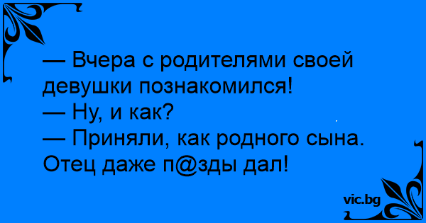— Вчера с родителями своей девушки познакомился!<br />— Ну, и как? <br />— Приняли, как родного сына. Отец даже п@зды дал!