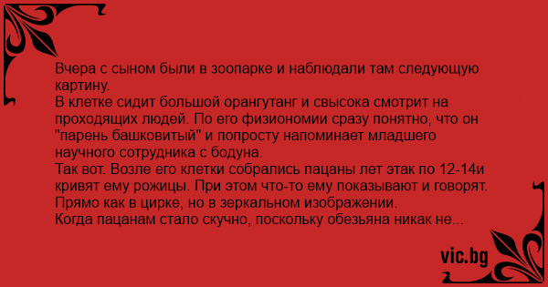 Так вот. Возле его клетки собрались пацаны лет этак по 12-14и кривят ему рожицы. При этом что-то ему показывают и говорят. Прямо как в цирке, но в зеркальном изображении.