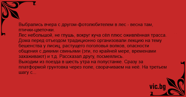 Выбрались вчера с другом-фотолюбителем в лес - весна там, птички-цветочки. Лес небольшой, не глушь, вокруг куча сёл плюс оживлённая трасса. Дома перед отъездом традиционно организовали лекцию на тему бешенства у лисиц, растущего поголовья волков, опасности общения с дикими свиньями (эти, по крайней мере, временами захаживают) и т.д. Рассказал другу, посмеялись. Выходим из поезда в шесть утра на полустанке. Сразу за платформой грунтовка через поле, сворачиваем на неё. На третьем шагу с обочины подрывается заяц (поезд его не спугнул, ага) и с треском ломится в кусты, где спугивает минимум трёх косуль (которые тоже до этого никуда не спешили), и вся эта банда валит со всех ног в лесопосадку. В это же время грунтовку метрах в двадцати впереди спокойно и с достоинством переход бобёр. Поезд за спиной даёт гудок и отправляется. Немая сцена. Я: О_о?! Друг (задумчиво): Да-а-а, ни кабанов тебе, ни лисиц...