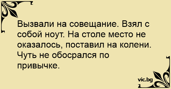 Вызвали на совещание. Взял с собой ноут. На столе место не оказалось, поставил на колени. Чуть не обосрался по привычке.