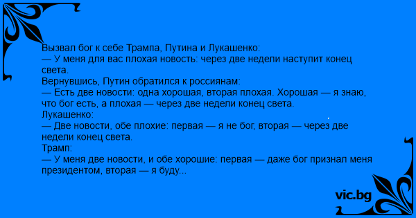 — Есть две новости: одна хорошая, вторая плохая. Хорошая — я знаю, что бог есть, а плохая — через две недели конец света.