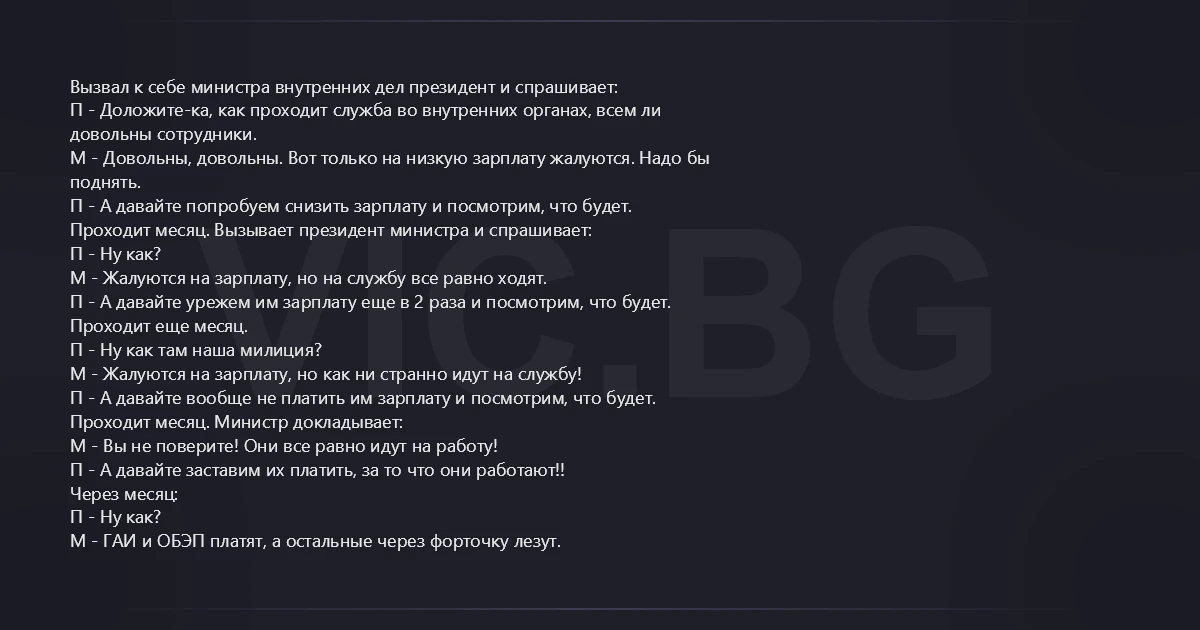 Вызвал к себе министра внутренних дел президент и спрашивает: П - Доложите-ка, как проходит служба во внутренних органах, всем ли довольны сотрудники. М - Довольны, довольны. Вот только на низкую зарплату жалуются. Надо бы поднять. П - А давайте попробуем снизить зарплату и посмотрим, что будет. Проходит месяц. Вызывает президент министра и спрашивает: П - Ну как? М - Жалуются на зарплату, но на службу все равно ходят. П - А давайте урежем им зарплату еще в 2 раза и посмотрим, что будет. Проходит еще месяц. П - Ну как там наша милиция? М - Жалуются на зарплату, но как ни странно идут на службу! П - А давайте вообще не платить им зарплату и посмотрим, что будет. Проходит месяц. Министр докладывает: М - Вы не поверите! Они все равно идут на работу! П - А давайте заставим их платить, за то что они работают!! Через месяц: П - Ну как? М - ГАИ и ОБЭП платят, а остальные через форточку лезут.