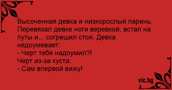 Высоченная девка и низкорослый парень. Перевязал девке ноги веревкой, встал на путы и... согрешил стоя. Девка недоумевает: