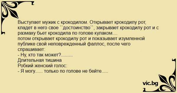 Facet w cyrku wychodzi na arenę z krokodylem. Staje na środku i kopie krokodyla w dupę. Krokodyl rozdziawił paszczę, a facet rozpina rozporek, wyciąga fiuta i kładzie krokodylowi na zęby. Potem bierze deskę i napierdala krokodyla po głowie. Krokodyl...