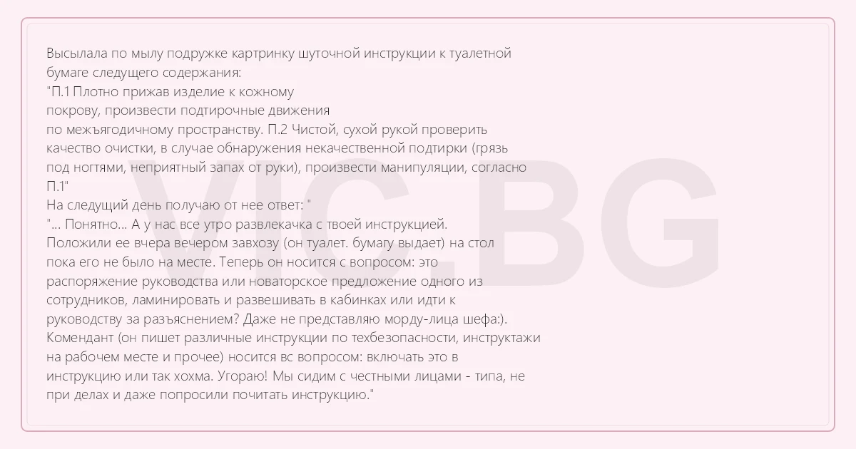 Высылала по мылу подружке картринку шуточной инструкции к туалетной бумаге следущего содержания: "П.1 Плотно прижав изделие к кожному покрову, произвести подтирочные движения по межъягодичному пространству. П.2 Чистой, сухой рукой проверить качество очистки, в случае обнаружения некачественной подтирки (грязь под ногтями, неприятный запах от руки), произвести манипуляции, согласно П.1" На следущий день получаю от нее ответ: " "... Понятно... А у нас все утро развлекачка с твоей инструкцией. Положили ее вчера вечером завхозу (он туалет. бумагу выдает) на стол пока его не было на месте. Теперь он носится с вопросом: это распоряжение руководства или новаторское предложение одного из сотрудников, ламинировать и развешивать в кабинках или идти к руководству за разъяснением? Даже не представляю морду-лица шефа:). Комендант (он пишет различные инструкции по техбезопасности, инструктажи на рабочем месте и прочее) носится вс вопросом: включать это в инструкцию или так хохма. Угораю! Мы сидим с честными лицами - типа, не при делах и даже попросили почитать инструкцию."