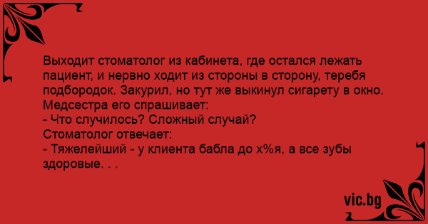 Выходит стоматолог из кабинета, где остался лежать пациент, и нервно ходит из стороны в сторону, теребя подбородок. Закурил, но тут же выкинул сигарету в окно. Медсестра его спрашивает: