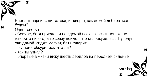 - Сейчас, батя приедет, и нас домой всех развезёт, только не говорите ничего, а то сразу поймет, что мы обкурились. Ну, едут они дамой, сидят, молчат, батя говорит: