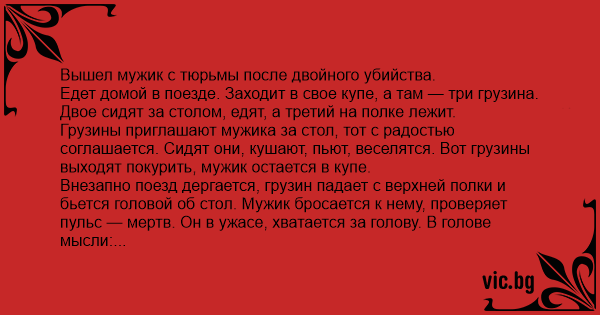 Внезапно поезд дергается, грузин падает с верхней полки и бьется головой об стол. Мужик бросается к нему, проверяет пульс — мертв. Он в ужасе, хватается за голову. В голове мысли: кто ж поверит, что не я, только после отсидки. Он, не долго думая, открывает окно и грузина туда выталкивает. Садится за стол и, как ни в чем не бывало, продолжает есть.