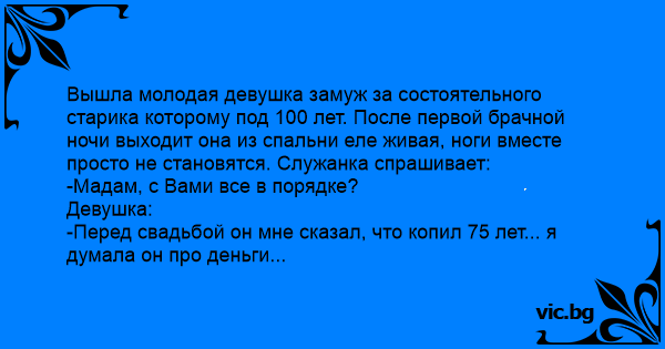 Вышла молодая девушка замуж за состоятельного старика которому под 100 лет. После первой брачной ночи выходит она из спальни еле живая, ноги вместе просто не становятся. Служанка спрашивает: