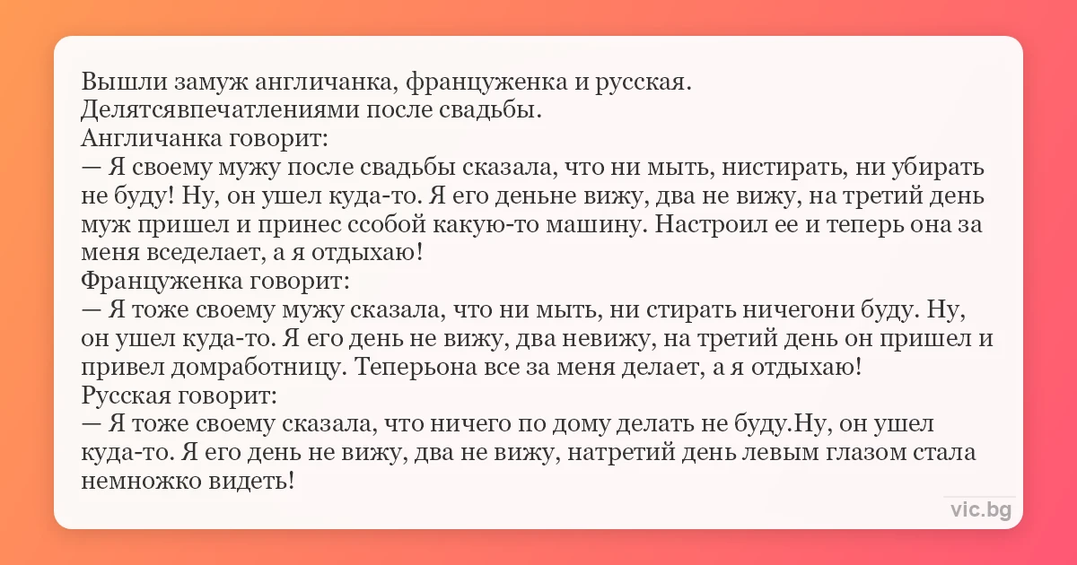 — Я своему мужу после свадьбы сказала, что ни мыть, нистирать, ни убирать не буду! Ну, он ушел куда-то. Я его деньне вижу, два не вижу, на третий день муж пришел и принес ссобой какую-то машину. Настроил ее и теперь она за меня вседелает, а я отдыхаю!
