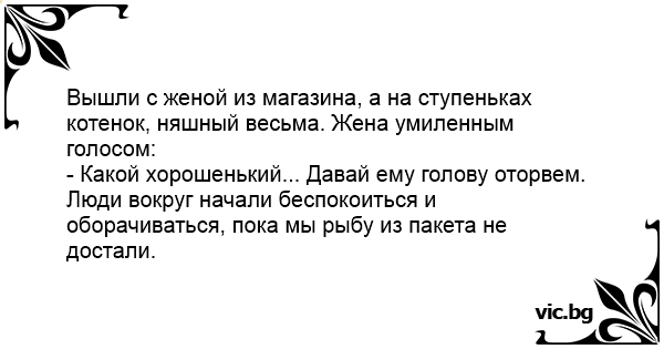 Вышли с женой из магазина, а на ступеньках котенок, няшный весьма. Жена умиленным голосом: