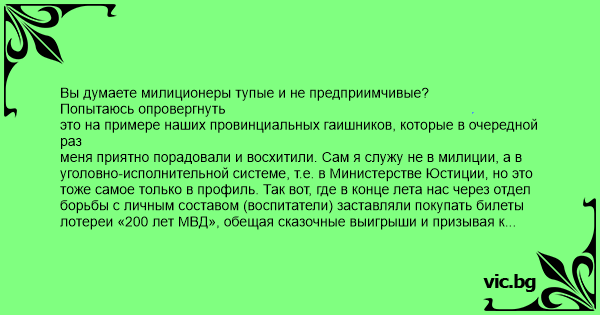Вы думаете милиционеры тупые и не предприимчивые? Попытаюсь опровергнуть это на примере наших провинциальных гаишников, которые в очередной раз меня приятно порадовали и восхитили. Сам я служу не в милиции, а в уголовно-исполнительной системе, т.е. в Министерстве Юстиции, но это тоже самое только в профиль. Так вот, где в конце лета нас через отдел борьбы с личным составом (воспитатели) заставляли покупать билеты лотереи «200 лет МВД», обещая сказочные выигрыши и призывая к офицерскому долгу. Каждый открещивался как мог (ужасно давила жаба даже 10 рублей выкидывать на эту туфту), но по паре билетов пришлось купить всем, то же самое естественно было наших друзей - коллег ментов. Розыгрыш состоялся 10 ноября и конечно же никто ни хpeнa не выиграл (во всяком случае у нас). Теперь сама история: дня три назад еду с другом (не в милиции не у нас не служащим) в его машине и вижу в отделении для кассет знакомые билетики чудо-лотереи, спрашиваю: где раздобыл это г… и на хpeнa тебе это, тем более тираж-то разыгран 4 месяца назад. Друг: …….. твою мать? Как разыгран? Я: Да вот на обороте мелкими буквами - 10 ноября 2001 года. Ну рассказывай, откуда билеты? Друг: Недавно остановил гаишник, проверил документы, все нормально, спасибо, говорит, товарищ водитель, что вы ничего не нарушаете, а не желаете ли вы добровольно исполнить свой гражданский долг, помочь нашей славной милиции бороться с преступностью, приобретя три билета лотереи «200 лет МВД», а может еще и выиграете новый автомобиль. Я на радости что не придирается и вежливо обращается, а также из жадности, надеясь на халяву машину получить, и купил три штуки по червонцу, тем более думаю явно не в карман же гаишнику, ему же за билеты отчитываться. Вот так простенько и со вкусом ребятки отбивают свои кровные денюжки. А сегодня утром уже мне прапорщик ГИБДД предлагал исполнить свой гражданский долг и очень удивлялся моему смеху, пока я ему корку не показал. Так что, друзья, если в вашем городе гаишники будут распространять может даже «Русское лото», смотрите на дату. Юра-тюремный доктор