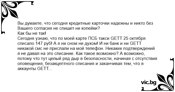 Сегодня узнаю, что по моей карте ПСБ такси GETT 25 октября списало 147 руб! А я ни сном ни духом! И ни банк и ни GETT никакой смс не прислали на мой телефон. Никаких подтверждений я не давал на это списание. Как такое возможно? А возможно, потому что тут целый ряд дыр в безопасности, начиная с отсутствия оповещения, безакцептного списания и заканчивая тем, что в аккаунты GETT можно записывать чужие карточки третьих лиц.