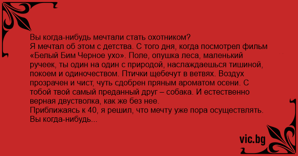Я мечтал об этом с детства. С того дня, когда посмотрел фильм «Белый Бим Черное ухо». Поле, опушка леса, маленький ручеек, ты один на один с природой, наслаждаешься тишиной, покоем и одиночеством. Птички щебечут в ветвях. Воздух прозрачен и чист, чуть сдобрен пряным ароматом осени. С тобой твой самый преданный друг – собака. И естественно верная двустволка, как же без нее.