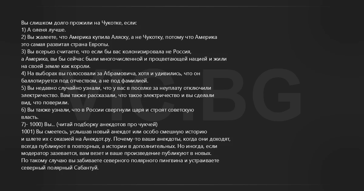 Вы слишком долго прожили на Чукотке, если: 1) А оленя лучше. 2) Вы жалеете, что Америка купила Аляску, а не Чукотку, потому что Америка это самая развитая страна Европы. 3) Вы всерьез считаете, что если бы вас колонизировала не Россия, а Америка, вы бы сейчас были многочисленной и процветающей нацией и жили на своей земле как короли. 4) На выборах вы голосовали за Абрамовича, хотя и удивились, что он баллотируется под отчеством, а не под фамилией. 5) Вы недавно случайно узнали, что у вас в поселке за неуплату отключили электричество. Вам также рассказали, что такое электричество и вы сделали вид, что поверили. 6) Вы также узнали, что в России свергнули царя и строят советскую власть. 7)- 1000) Вы... (читай подборку анекдотов про чукчей) 1001) Вы смеетесь, услышав новый анекдот или особо смешную историю и шлете их с оказией на Анекдот.ру. Почему-то ваши анекдоты, когда они доходят, всегда публикуют в повторных, а истории в дополнительных. Но иногда, если модератор зазевается, вам везет и ваше произведение публикуют в новых. По такому случаю вы забиваете северного полярного пингвина и устраиваете северный полярный Сабантуй.