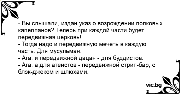- Вы слышали, издан указ о возрождении полковых капелланов? Теперь при каждой части будет передвижная церковь!