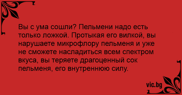 Вы с ума сошли? Пельмени надо есть только ложкой. Протыкая его вилкой, вы нарушаете микрофлору пельменя и уже не сможете насладиться всем спектром вкуса, вы теряете драгоценный сок пельменя, его внутреннюю силу.