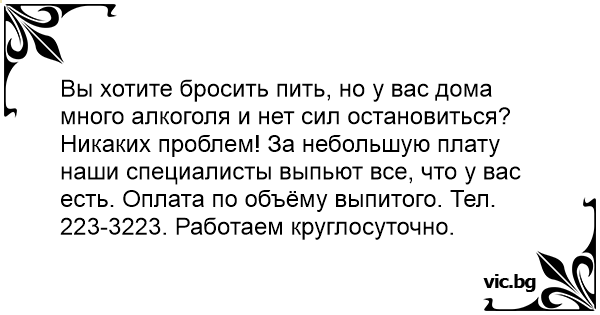 Никаких проблем! За небольшую плату наши специалисты выпьют все, что у вас есть. Оплата по объёму выпитого. Тел. 223-3223. Работаем круглосуточно.