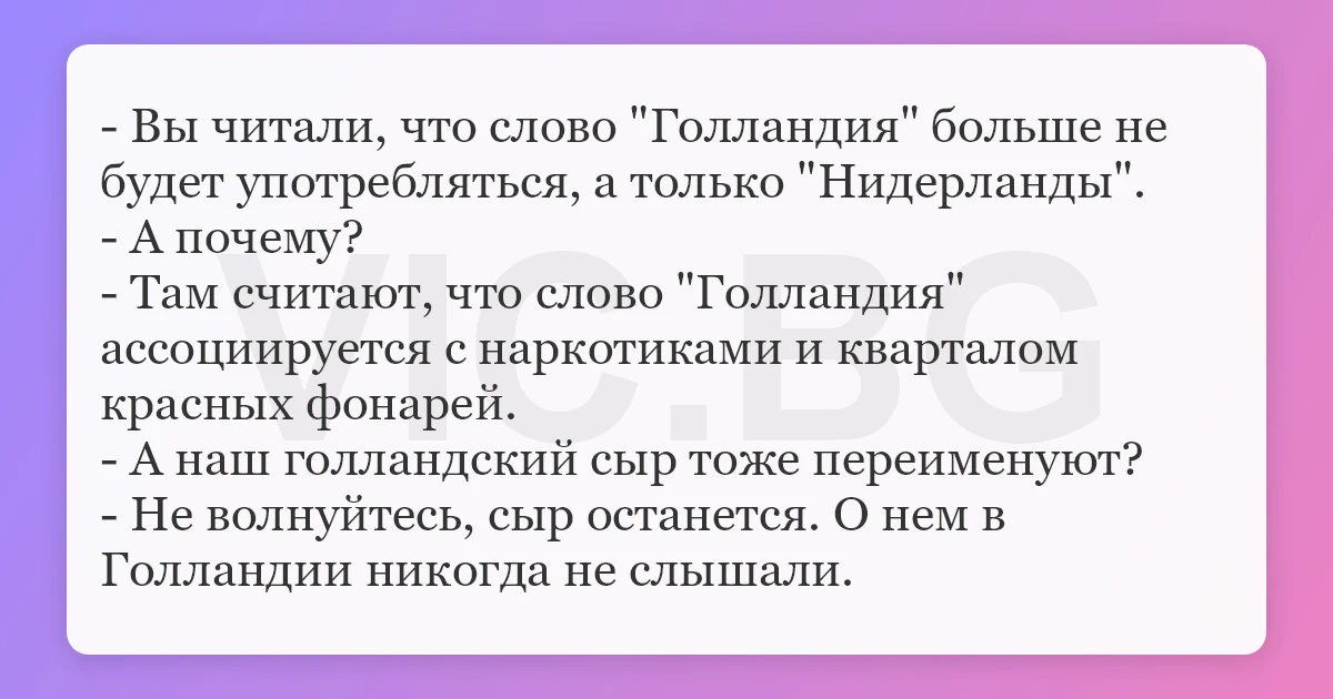 - Вы читали, что слово "Голландия" больше не будет употребляться, а только "Нидерланды". - А почему? - Там считают, что слово "Голландия" ассоциируется с наркотиками и кварталом красных фонарей. - А наш голландский сыр тоже переименуют? - Не волнуйтесь, сыр останется. О нем в Голландии никогда не слышали.