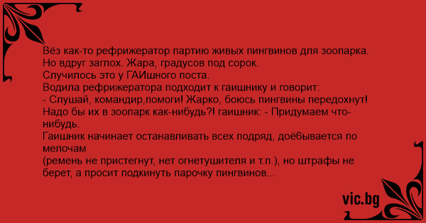 Гаишник: -Мужики, пожалуйста, отвезите пингвинов в зоопарк.