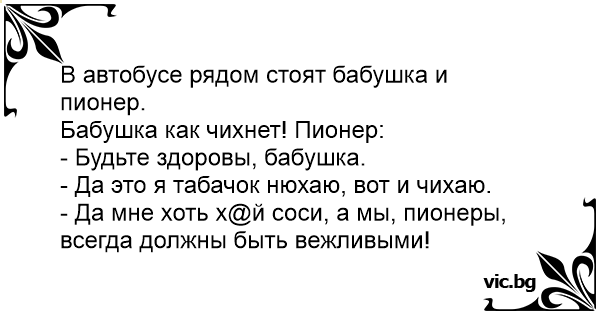 - Да мне хоть х@й соси, а мы, пионеры, всегда должны быть вежливыми!