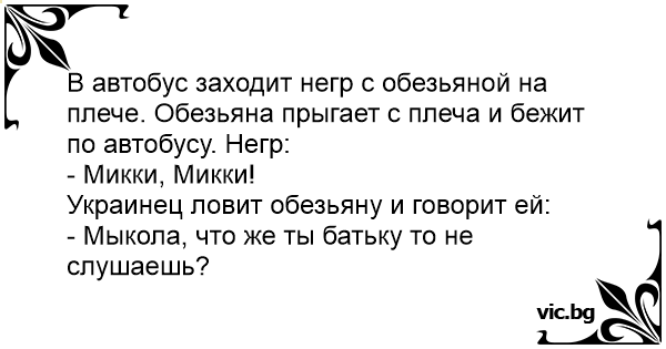 В автобус заходит нeгp с обезьяной на плече. Обезьяна прыгает с плеча и бежит по автобусу. Heгp: