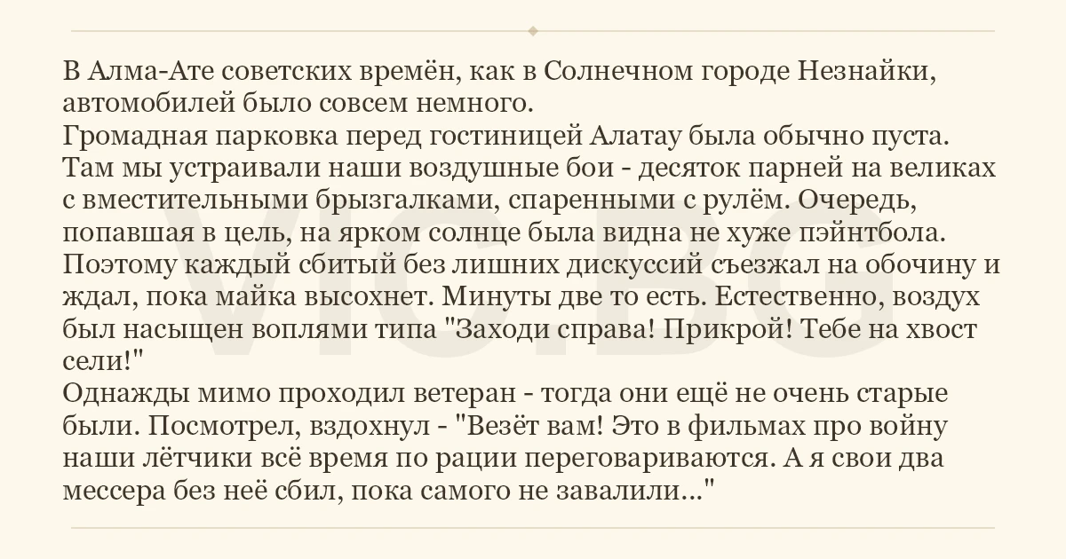 В Алма-Ате советских времён, как в Солнечном городе Незнайки, автомобилей было совсем немного. Громадная парковка перед гостиницей Алатау была обычно пуста. Там мы устраивали наши воздушные бои - десяток парней на великах с вместительными брызгалками, спаренными с рулём. Очередь, попавшая в цель, на ярком солнце была видна не хуже пэйнтбола. Поэтому каждый сбитый без лишних дискуссий съезжал на обочину и ждал, пока майка высохнет. Минуты две то есть. Естественно, воздух был насыщен воплями типа "Заходи справа! Прикрой! Тебе на хвост сели!" Однажды мимо проходил ветеран - тогда они ещё не очень старые были. Посмотрел, вздохнул - "Везёт вам! Это в фильмах про войну наши лётчики всё время по рации переговариваются. А я свои два мессера без неё сбил, пока самого не завалили..."