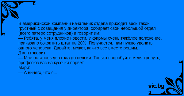 — Ребята, у меня плохие новости. У фирмы очень тяжёлое положение, приказано сократить штат на 20%. Получается, нам нужно уволить одного человека. Давайте, может, как-то все вместе решим...