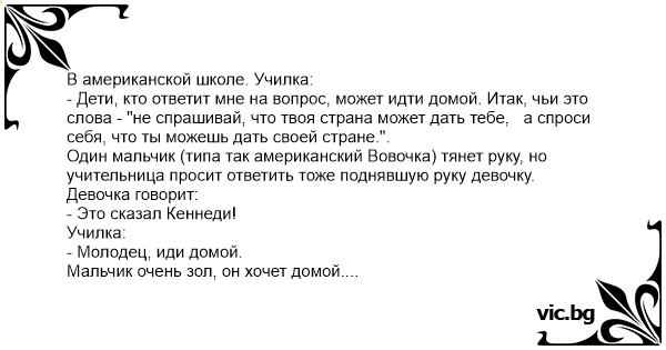 - Дети, кто ответит мне на вопрос, может идти домой. Итак, чьи это слова - "не спрашивай, что твоя страна может дать тебе, а спроси себя, что ты можешь дать своей стране.".