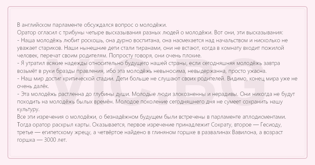 В английском парламенте обсуждался вопрос о молодёжи. Оратор огласил с трибуны четыре высказывания разных людей о молодёжи. Вот они, эти высказывания: - Наша молодёжь любит роскошь, она дурно воспитана, она насмехается над начальством и нисколько не уважает стариков. Наши нынешние дети стали тиранами, они не встают, когда в комнату входит пожилой человек, перечат своим родителям. Попросту говоря, они очень плохие. - Я утратил всякие надежды относительно будущего нашей страны, если сегодняшняя молодёжь завтра возьмёт в руки бразды правления, ибо эта молодёжь невыносима, невыдержанна, просто ужасна. - Наш мир достиг критической стадии. Дети больше не слушают своих родителей. Видимо, конец мира уже не очень далёк. - Эта молодёжь растленна до глубины души. Молодые люди злокозненны и нерадивы. Они никогда не будут походить на молодёжь былых времён. Молодое поколение сегодняшнего дня не сумеет сохранить нашу культуру. Все эти изречения о молодёжи, о безнадёжном будущем были встречены в парламенте аплодисментами. Тогда оратор раскрыл карты. Оказывается, первое изречение принадлежит Сократу, второе — Гесиоду, третье — египетскому жрецу, а четвёртое найдено в глиняном горшке в развалинах Вавилона, а возраст горшка — 3000 лет.