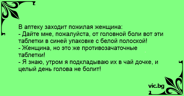 Една баба влегува во аптека и ѝ вели на аптекарката: - Ќерко, дај ми таблети против главоболка! Еве, од овие белите со сината лентичка! - Бабичке тоа се таблети за контрацепција! – Возвраќа...