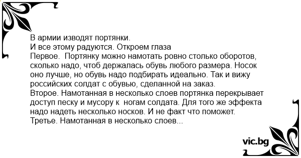 Второе. Намотанная в несколько слоев портянка перекрывает доступ песку и мусору к ногам солдата. Для того же эффекта надо надеть несколько носков. И не факт что поможет.