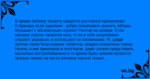 К примеру если художник - добро пожаловать красить заборы. Музыкант с абсолютным слухом? Постой на шухере. Если никаких совсем талантов нету, то их в тебе непременно откроют, разовьют, и используют по назначению. Я, среди прочих своих безусловных талантов, владел плакатным пером. Нынче, в век принтеров и плоттеров, даже сложно представить, насколько востребованным в то время было умение провести прямую линию на листе ватмана черной тушью.