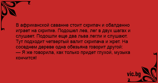 В африканській саванні стоїть скрипаль і добре грає на скрипці. Підійшов лев, ліг в двох кроках і слухає. Підійшли ще два леви лягли і слухають. Тут підходить четвертий, валить скрипаля і жере....