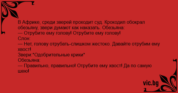 В Африке, среди зверей проходит суд. Крокодил обокрал обезьяну, звери думают как наказать. Обезьяна: