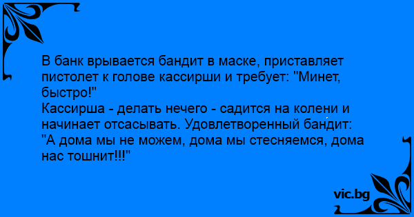В банк врывается бандит в маске, приставляет пистолет к голове кассирши и требует: "Mинet, быстро!"