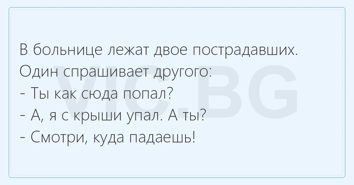 В больнице лежат двое пострадавших. Один спрашивает другого: - Ты как сюда попал? - А, я с крыши упал. А ты? - Смотри, куда падаешь!