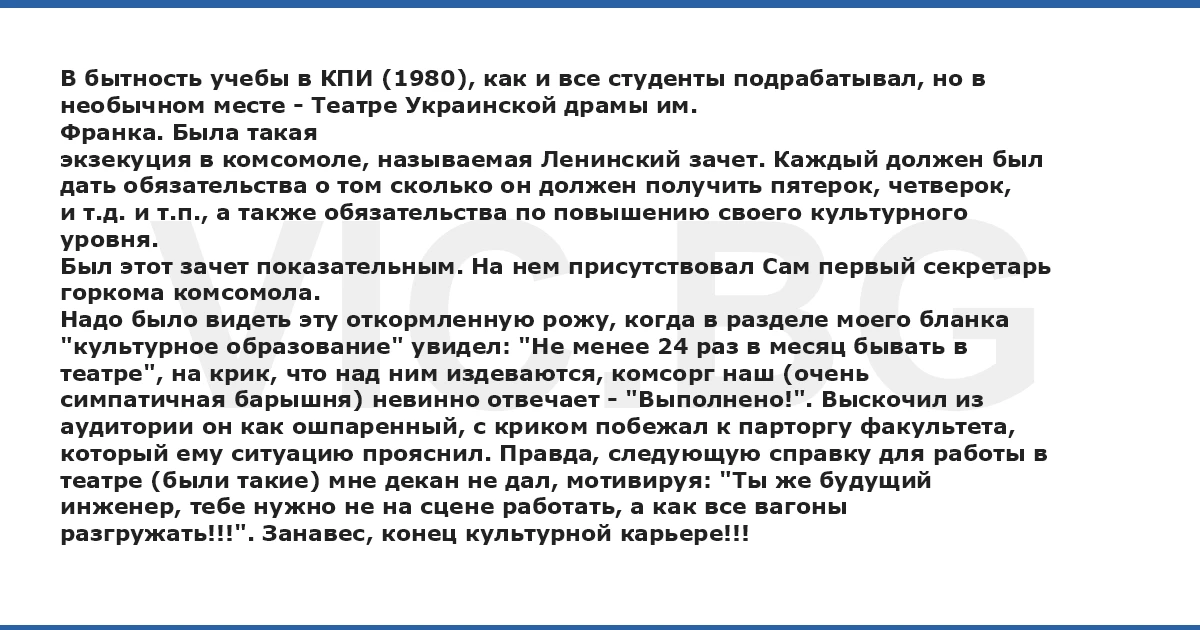В бытность учебы в КПИ (1980), как и все студенты подрабатывал, но в необычном месте - Театре Украинской драмы им. Франка. Была такая экзекуция в комсомоле, называемая Ленинский зачет. Каждый должен был дать обязательства о том сколько он должен получить пятерок, четверок, и т.д. и т.п., а также обязательства по повышению своего культурного уровня. Был этот зачет показательным. На нем присутствовал Сам первый секретарь горкома комсомола. Надо было видеть эту откормленную рожу, когда в разделе моего бланка "культурное образование" увидел: "Не менее 24 раз в месяц бывать в театре", на крик, что над ним издеваются, комсорг наш (очень симпатичная барышня) невинно отвечает - "Выполнено!". Выскочил из аудитории он как ошпаренный, с криком побежал к парторгу факультета, который ему ситуацию прояснил. Правда, следующую справку для работы в театре (были такие) мне декан не дал, мотивируя: "Ты же будущий инженер, тебе нужно не на сцене работать, а как все вагоны разгружать!!!". Занавес, конец культурной карьере!!!