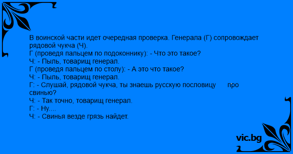 Г: - Слушай, рядовой чукча, ты знаешь русскую пословицу про свинью?