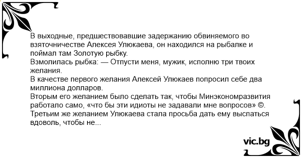 В выходные, предшествовавшие задержанию обвиняемого во взяточничестве Алексея Улюкаева, он находился на рыбалке и поймал там Золотую рыбку.