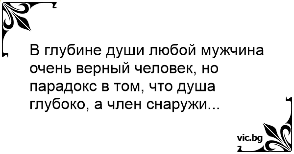 В глубине души любой мужчина очень верный человек, но парадокс в том, что душа глубоко, а члeн снаружи...