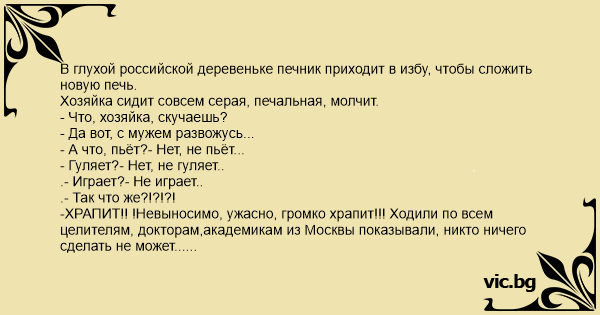 На следующий день печник приходит доделывать печку, ему накрывают стол, благодарят, мол семью спас:- А как же так, академики из Москвы не знали, а ты, печник деревенский, такое средство от храпа знаешь?!
