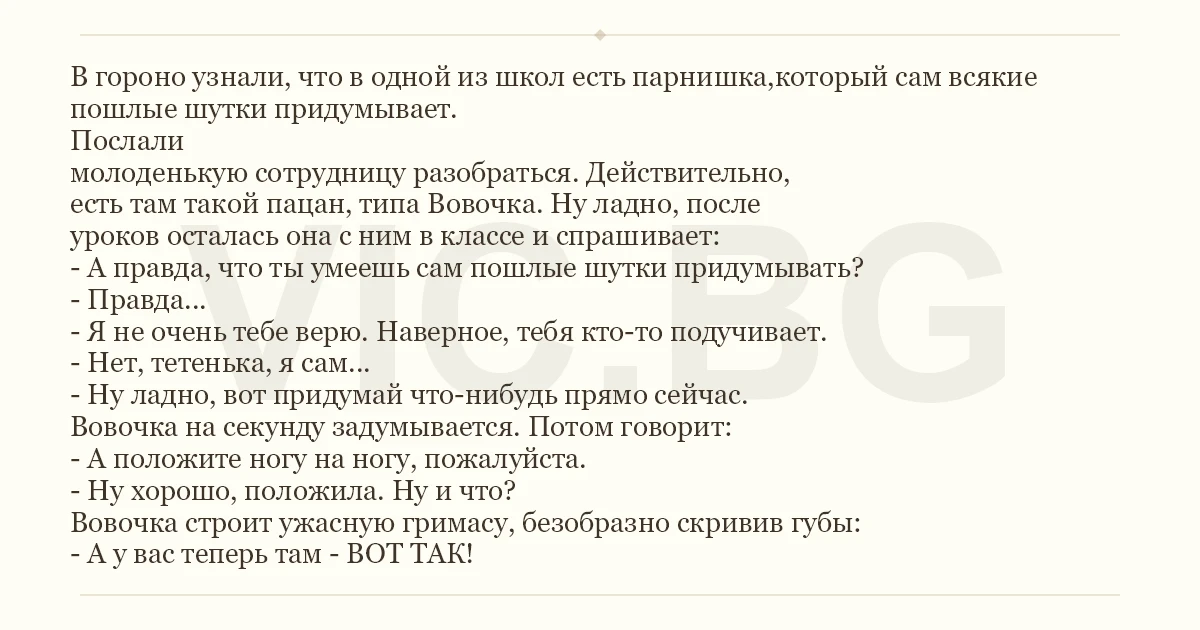 В гороно узнали, что в одной из школ есть парнишка,который сам всякие пошлые шутки придумывает. Послали молоденькую сотрудницу разобраться. Действительно, есть там такой пацан, типа Вовочка. Ну ладно, после уроков осталась она с ним в классе и спрашивает: - А правда, что ты умеешь сам пошлые шутки придумывать? - Правда... - Я не очень тебе верю. Наверное, тебя кто-то подучивает. - Нет, тетенька, я сам... - Ну ладно, вот придумай что-нибудь прямо сейчас. Вовочка на секунду задумывается. Потом говорит: - А положите ногу на ногу, пожалуйста. - Ну хорошо, положила. Ну и что? Вовочка строит ужасную гримасу, безобразно скривив губы: - А у вас теперь там - ВОТ ТАК!