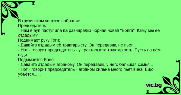 - Нам в аул паступила па разнарадкэ чорная новая "Волга". Каму мы её отдадым?
